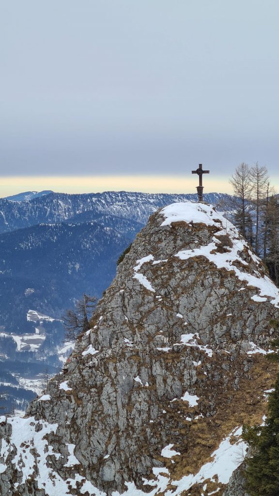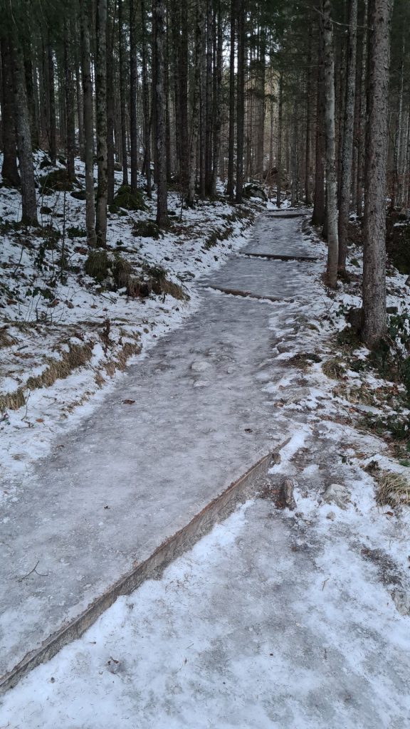 Der Weg vom Parkplatz zur Mittelstation war schon ganz ok. Oben allerdings war nur die Aussichtsplattform geräumt. Außerhalb der Terrasse war es komplett vereist. Teilweise war der Untergrund so glatt, dass man ohne Spikes nicht mehr gegangen, sondern eher völlig unkontrolliert gerutscht wäre. Es war ziemlich offensichtlich, dass ich ohne diese Dinger unter den Schuhen entweder sehr früh hätte umdrehen müssen oder irgendwann ziemlich unschön Bekanntschaft mit dem Boden gemacht hätte. Im schlimmsten Fall mit dem Boden im Tal, die Abhänge dort sind steil.