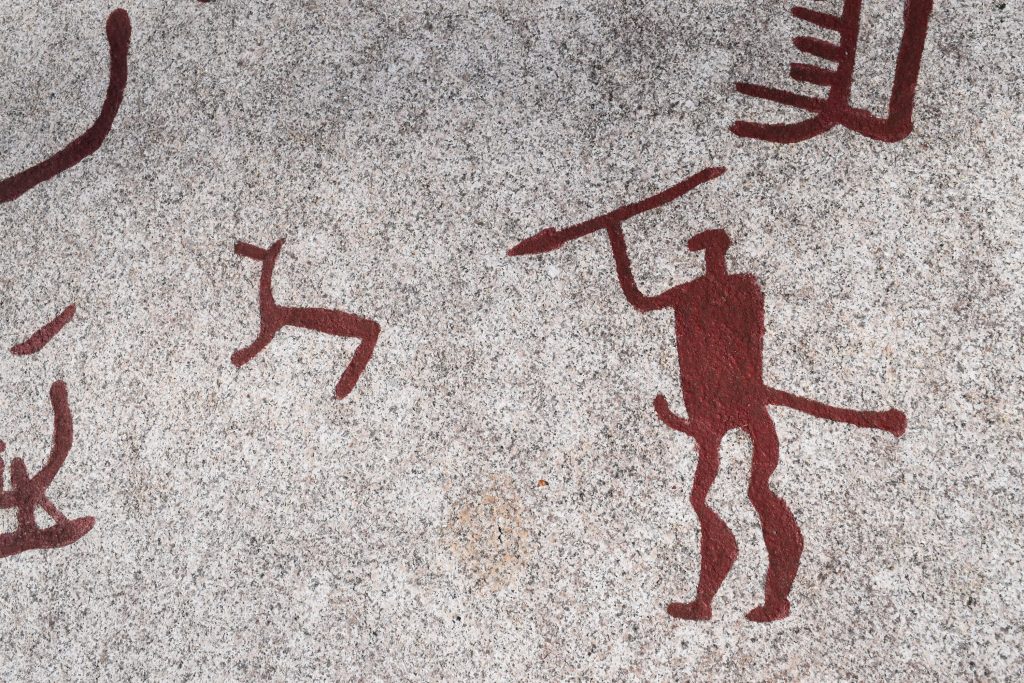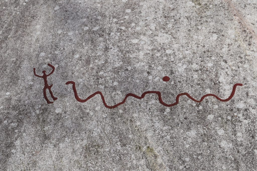 Tanumshede klingt nach nichts, ist aber magisch. Eine ausgewanderte Holländerin hatte dort eine zuckersüße Unterkunft, komplett holländisch eingerichtet. Sie hat uns sogar ihr Auto als Mietwagen geliehen, damit wir uns die abseits gelegenen Felsritzungen aus der Bronzezeit anschauen konnten. Jahrtausende alte Bilder in den Stein geritzt. Einfach so, mitten in der schwedischen Landschaft. Ich hab zu diesen Bildern einen besonderen Bezug. Als ich angefangen habe, meine Fotos auf Stock-Plattformen zu verkaufen, waren meine ersten beiden Verkäufe der P€ni$-Jäger und der Schlangen-P€ni$, wie hier wunderbar zu erkennen: